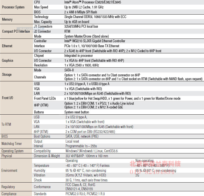 The Advantech MIC-3329 is based on Intel® Atom™ technology, previously codenamed Baytrail and is designed to provide balanced performance and power efficiency. The MIC-3329 is a 3U CompactPCI® processor blade designed for dual-core Intel® Atom E3827 and quad-core Intel® Atom E3845 processors, and up to 4GB soldered DDR3L-1066/1333 ECC memory. It is available in single and dual slot form factor, offering a range of I/O functionality by XTM (8HP) & Rear I/O extensions.