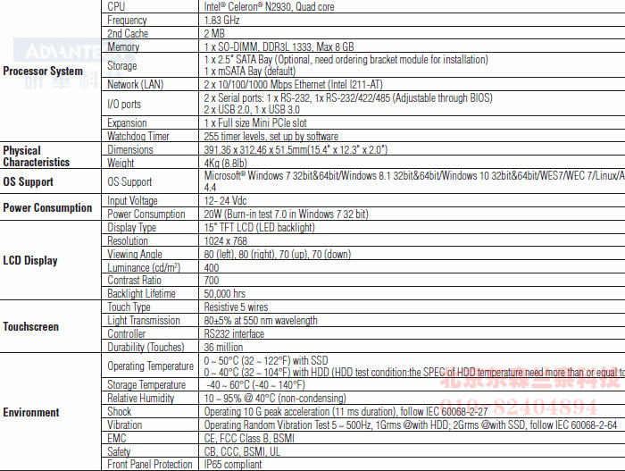 Intel Celeron N2930 Fanless Panel PC with 15" XGA LED backlight |