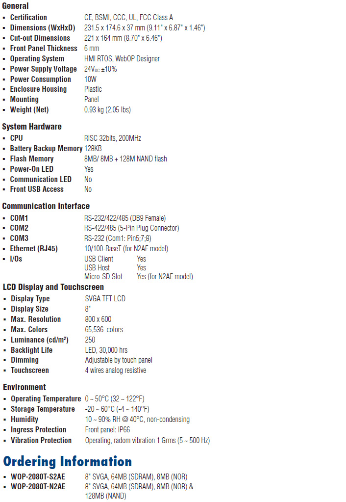 WOP-2080T-S2AE | 8" SVGA, 64MB (SDRAM), 8MB (NOR) |